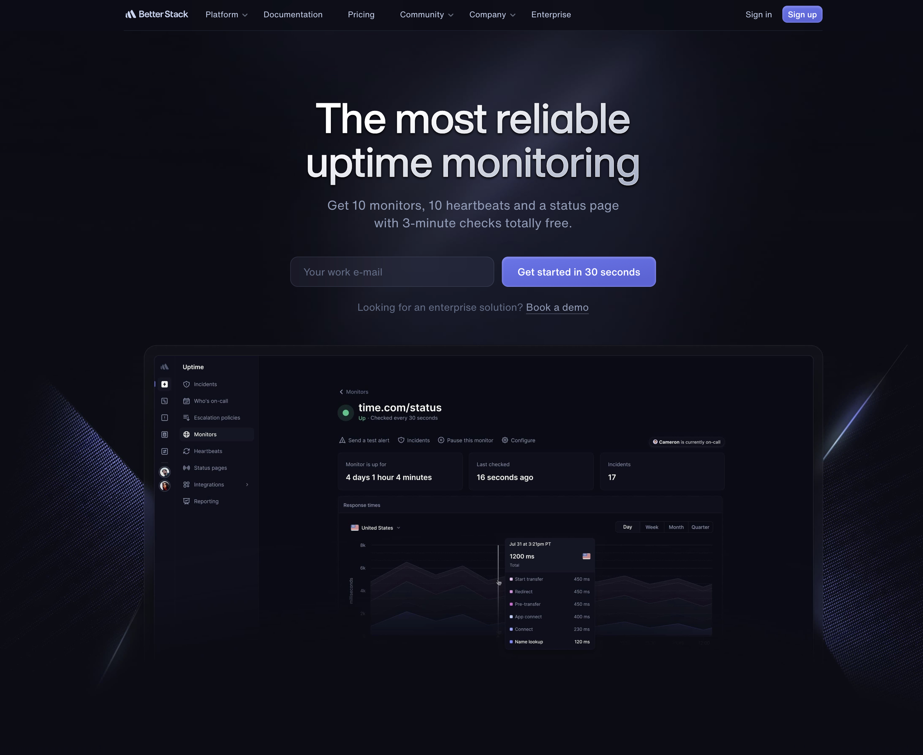 Teams that need incident management and on-call rotations built into their monitoring. If you just want uptime checks, Better Stack is overkill and overpriced. But if you need PagerDuty-style features, it's a good alternative to buying multiple products.