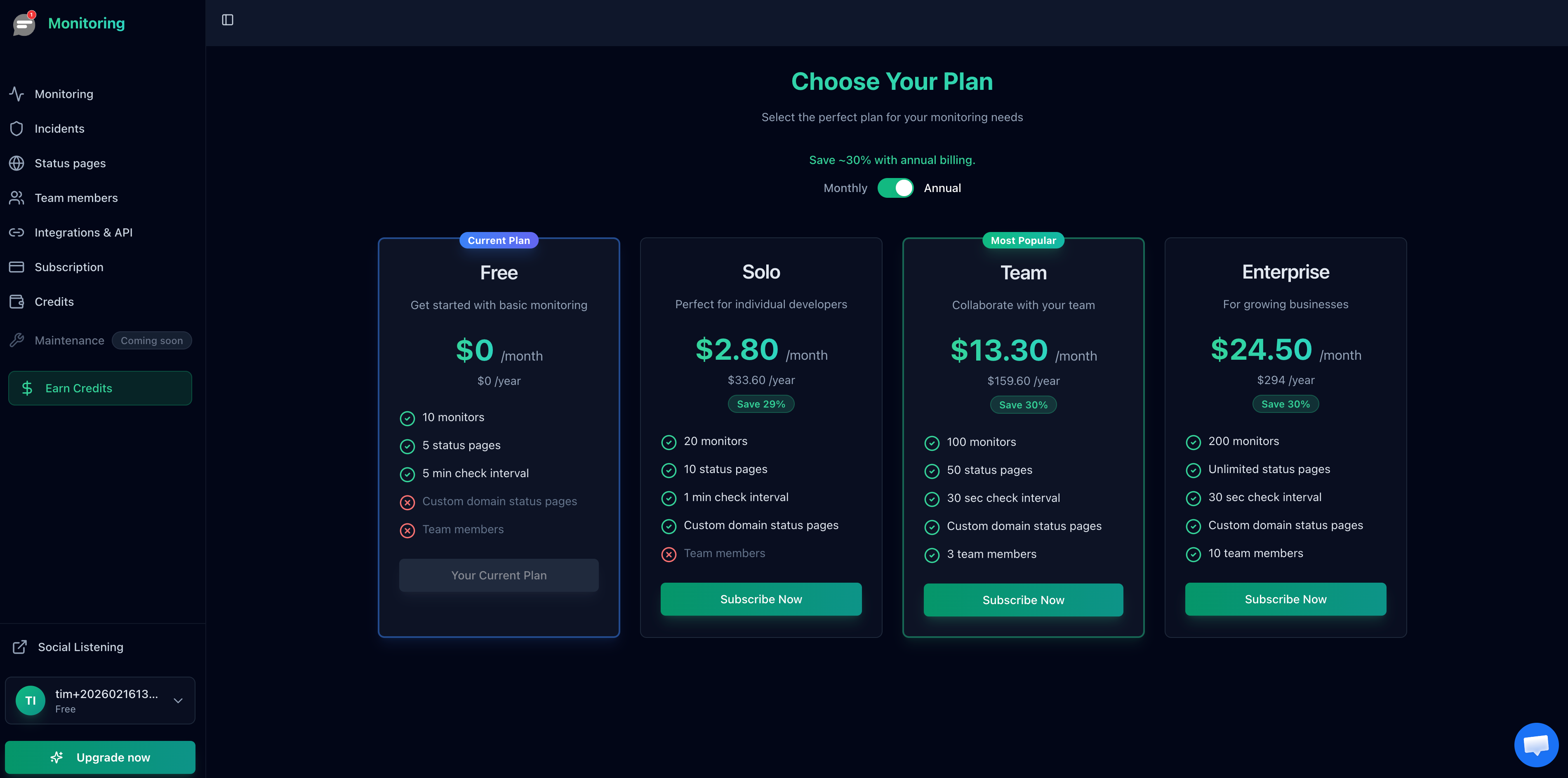 - Team ($29/mo): 100 monitors, 1 min intervals