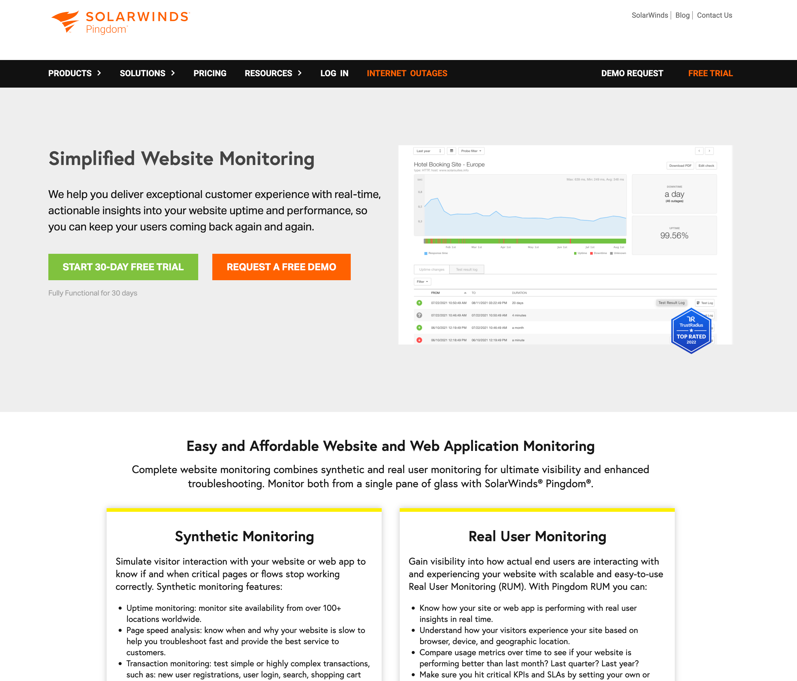 Pingdom splits functionality across separate products with separate pricing. Synthetic monitoring is one plan. Real User Monitoring is another. Status pages are included, but limited to just 1 per organization with custom domains restricted to HTTP only. Competitors offer multiple status pages with HTTPS custom domains.