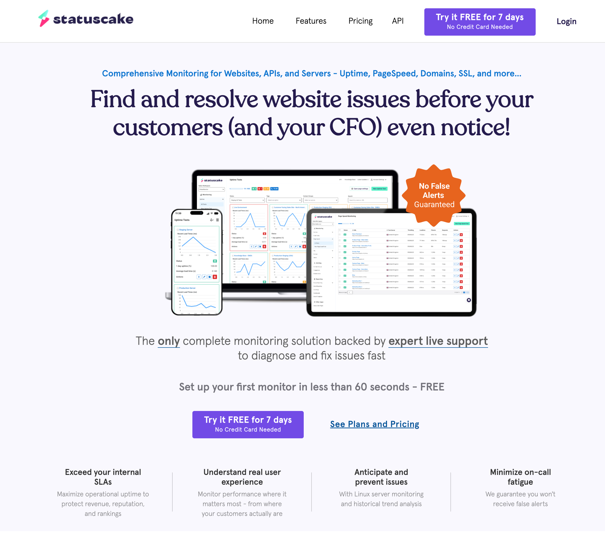 | StatusCake | $20/mo | 10 monitors | 1 min (paid) | Paid only | Free (1 monitor) |