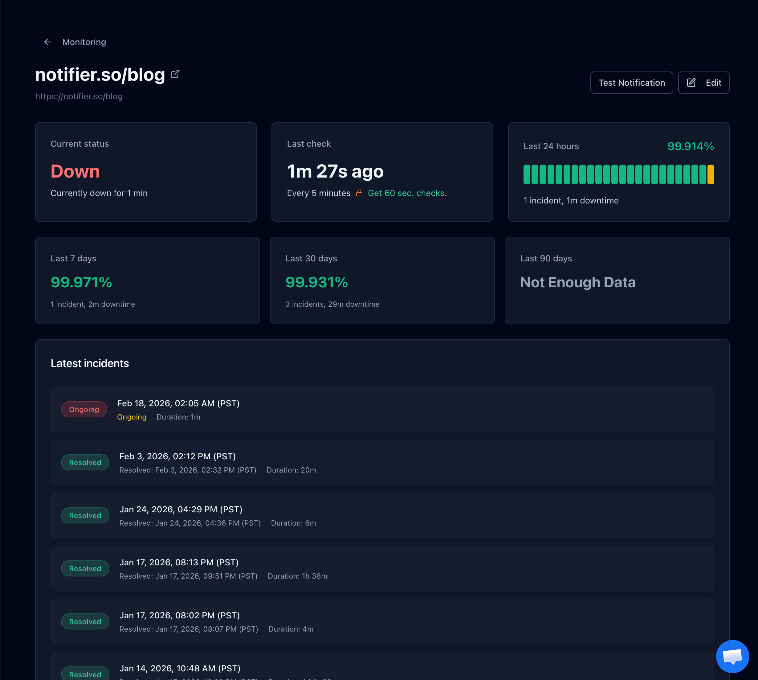 Notifier's monitor detail page shows uptime history and response times over time. You can spot database degradation patterns before they turn into full outages.